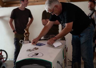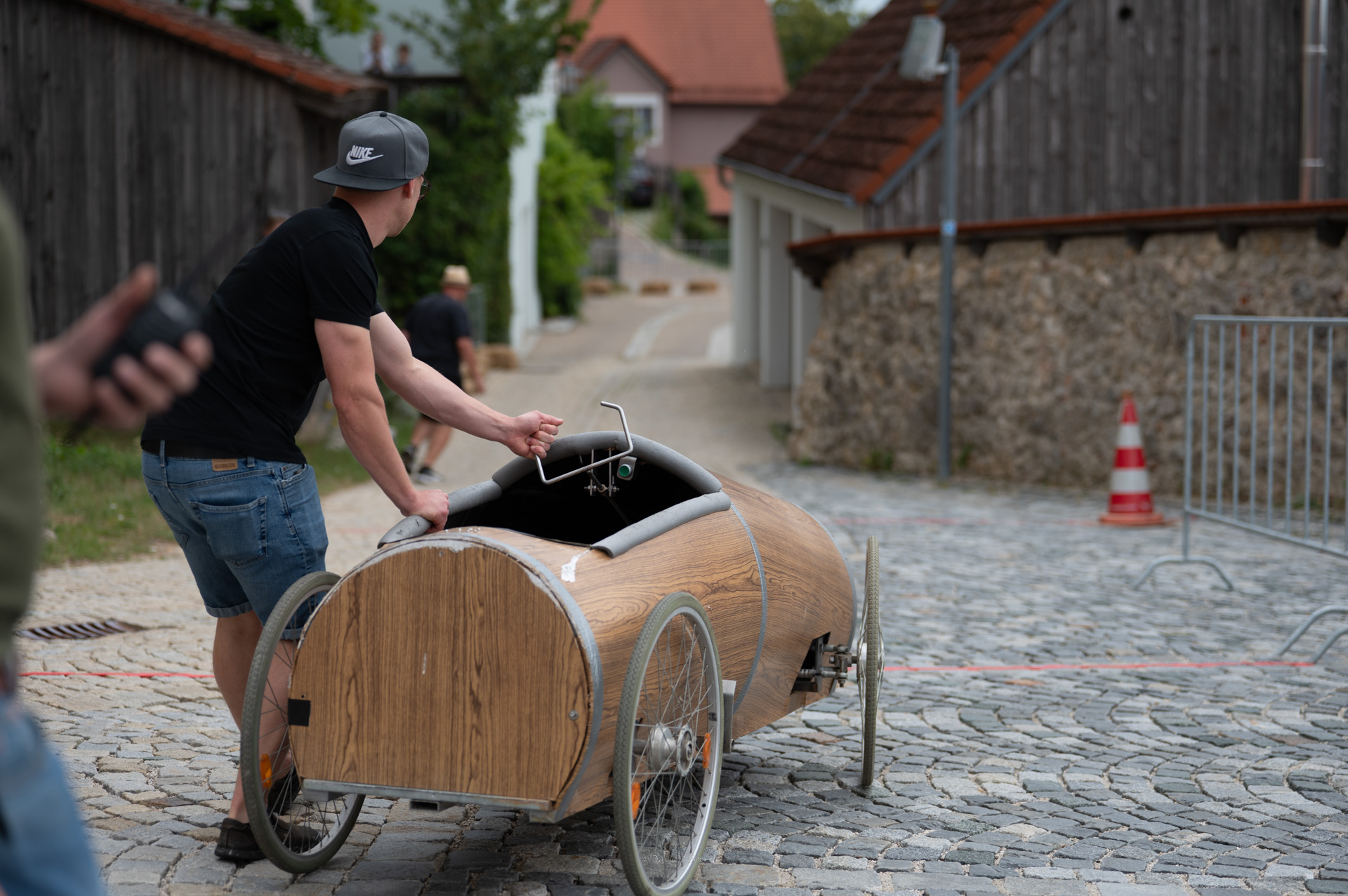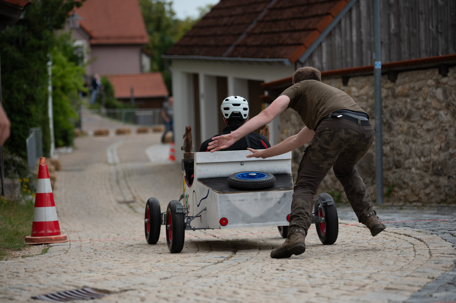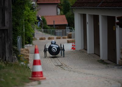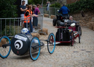 Deine Seifenkiste benötigt mindestens 4 Räder, eine funktionierende Lenkung und zuverlässige Bremsen. Bei voller Bremskraft dürfen sich die Räder nicht mehr drehen. Eine „Stempelbremse“ ist erlaubt. Wegen des Kopfsteinpflasters auf der Strecke solltest du geeignete Räder wählen. Alle Verbindungen (Achsen, Lenkung, Bremsen) müssen gesichert sein (z.B. selbstsichernde Muttern, Splinte). Außerdem ist vorne und hinten eine stabile Zugöse zum Abschleppen verpflichtend.